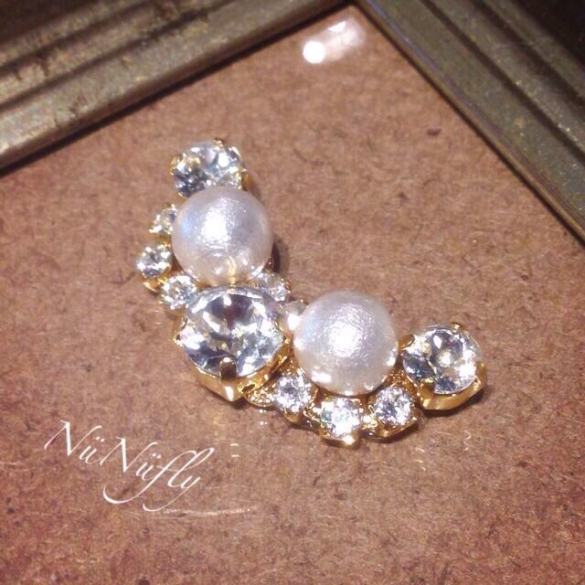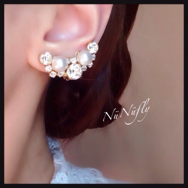 クリスタル色のスロワフスキーとコットンパールを使用したシンプル且つゴージャスなイヤーカフ(ピアカフ)です♡