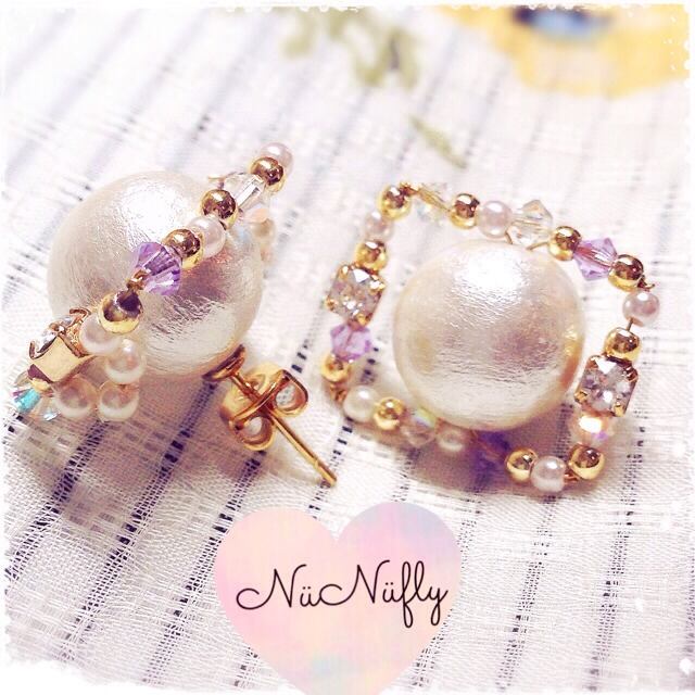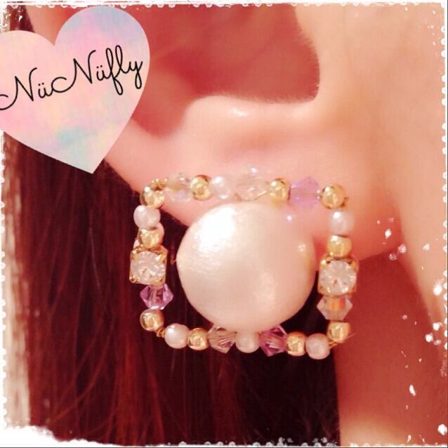 コットンパールが周りの小さなスワロやパールたちに囲まれて♡今までにない斬新かつ繊細なピアスにデザインしました。