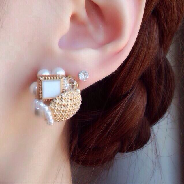 白のスクエアボタン、細かいビーズが重ね合わせたようなデザインのボタン、スワロフスキー、パールでできた白とゴールドを基調としたボタンピアスです♡